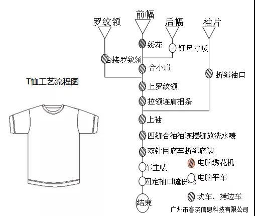 为了更好地表达服装的加工工艺流程,行业一般采用流程图方式对款式的工艺流程进行描述,通过特定的图示来表达流程中的各种加工工序,再通过箭头方式将流程顺序表示出来,清晰明了地表达工艺流程中各部分的结构以及工艺的生产过程,就形成了工艺流程图,如下图,就是T恤的生产工艺流程图: