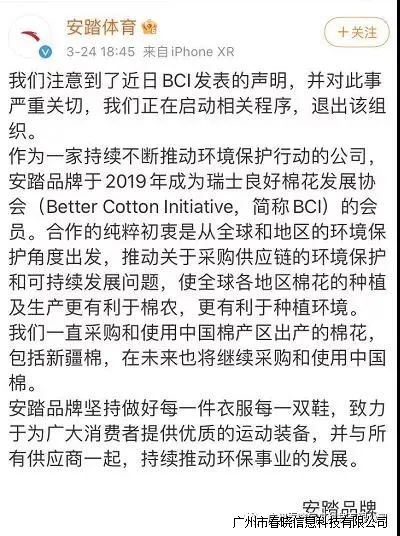 刚刚,安踏官方微博@安踏体育发表声明称,注意到了近日BCI发表的声明,并对此事严重关切,优德88正在启动相关程序,退出该组织。声明还称,安踏一直采购和使用中国棉产区出产的棉花,包括新疆棉,在未来也将继续采购和使用中国棉。